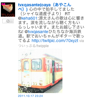 で、駅猫おさむは居なかったのですが、駅でギターを引きながら唄うおいちゃんがいました。ツイッターで呟いたら即座に返事があり、誰かすぐわかりました。(笑)↓