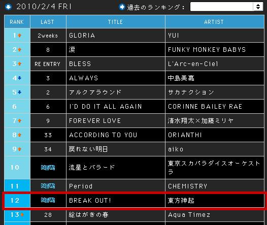 ところで、良く聞くラジオ局でチャートの番組があるのですが、(CDセールスとか曲がかかった数とか、一番重点を置いているのはリスナーのリクエスト数らしいけど)、先週は惜しくも12位でした。